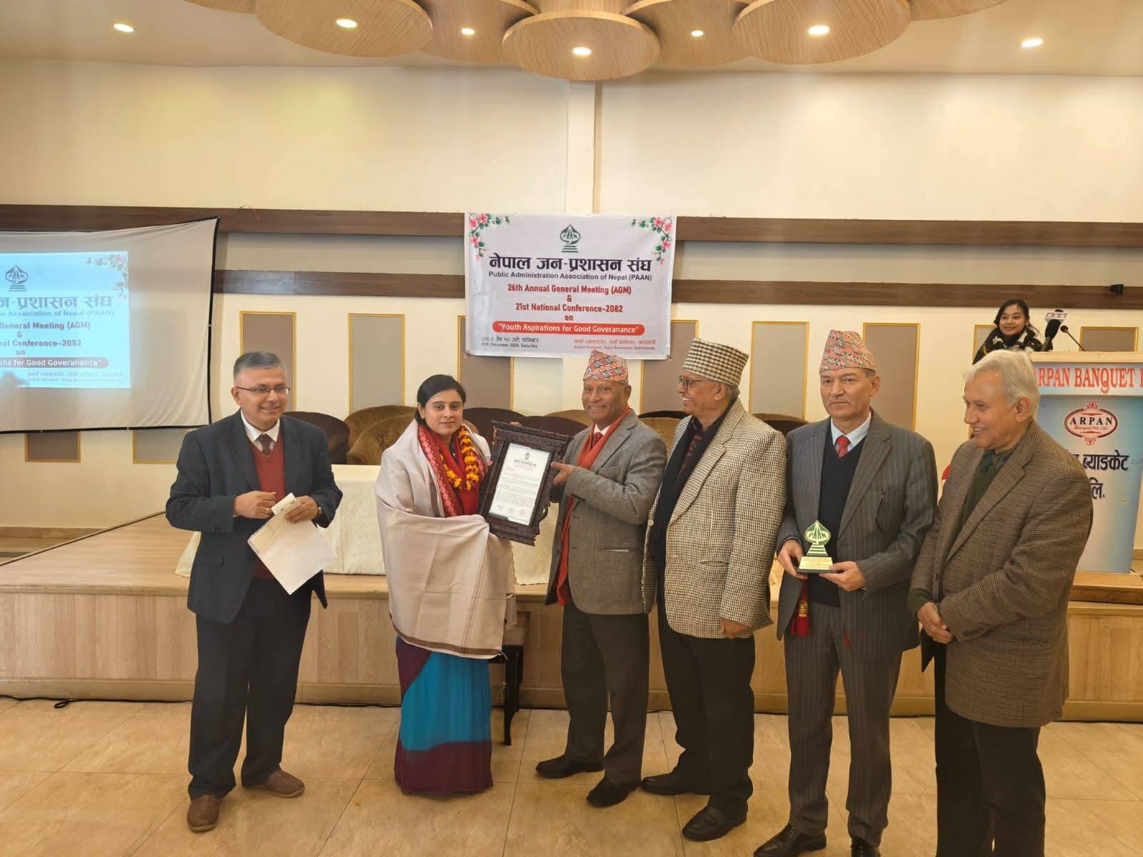रत्ननगर । नेपाल जनप्रशासन संघ (पान) को २६औँ साधारण सभाका अवसरमा रत्ननगर नगरपालिकाका प्रशासन शाखा प्रमुख वरिष्ठ अधिकृत सविता अर्याललाई ‘पान उत्कृष्ट राष्ट्रसेवक सम्मान’ प्रदान गरिएको छ ।