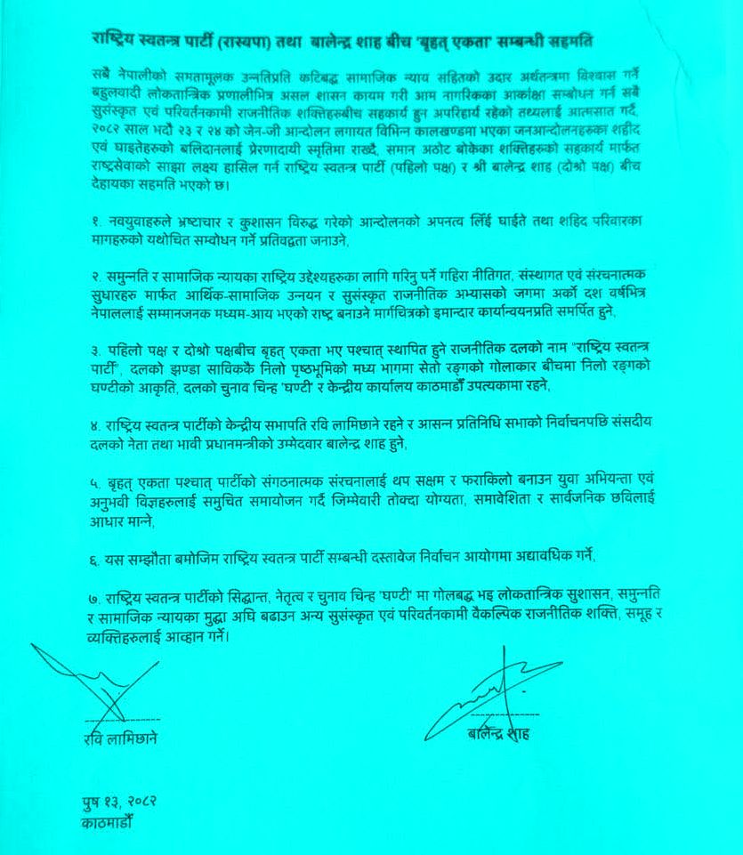 काठमाडौँ । राष्ट्रिय स्वतन्त्र पार्टी (रास्वपा) र काठमाडौँ महानगरपालिकाका प्रमुख बालेन्द्र शाहबीच विभिन्न विषयमा सात बुँदे सहमति भएको छ ।
